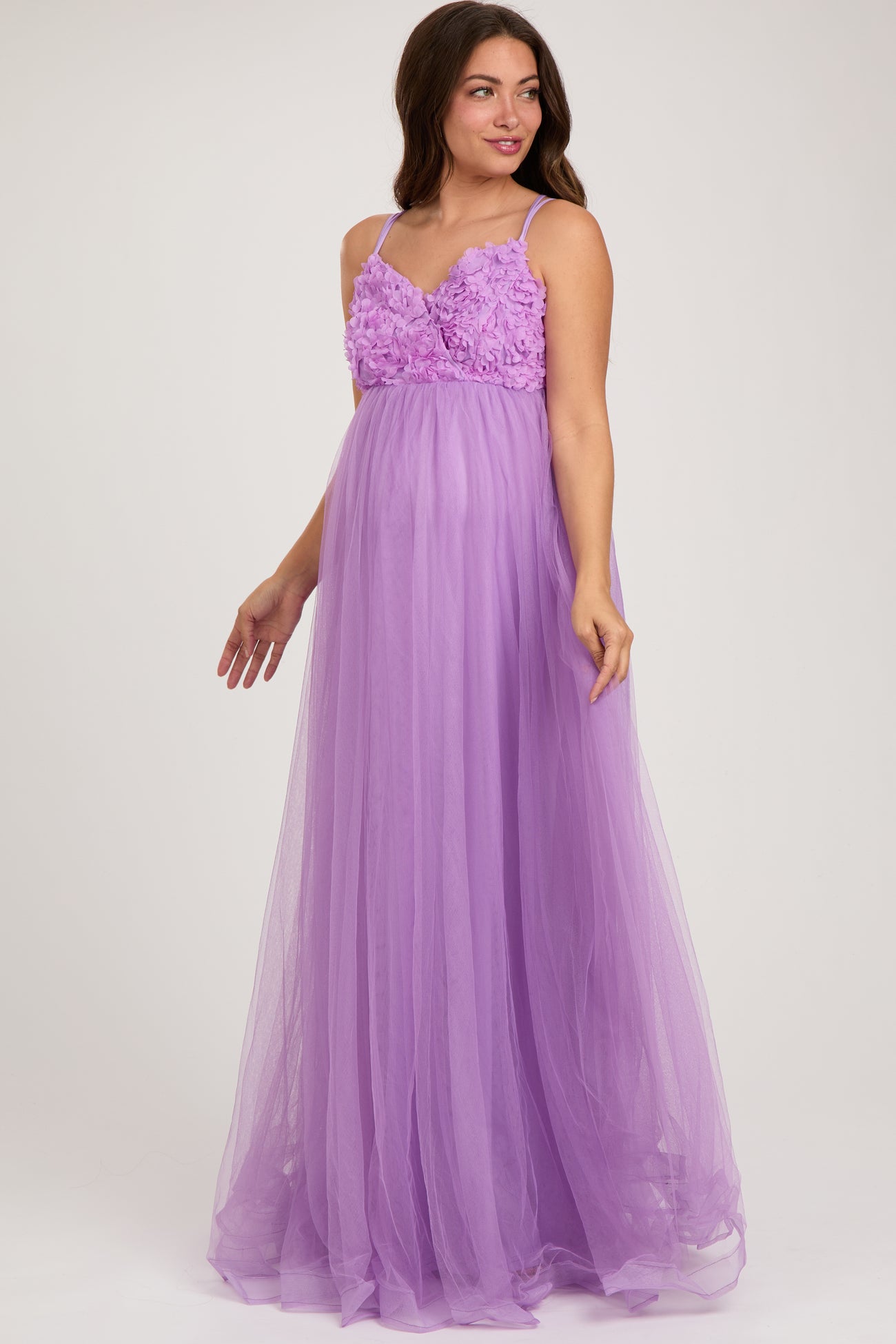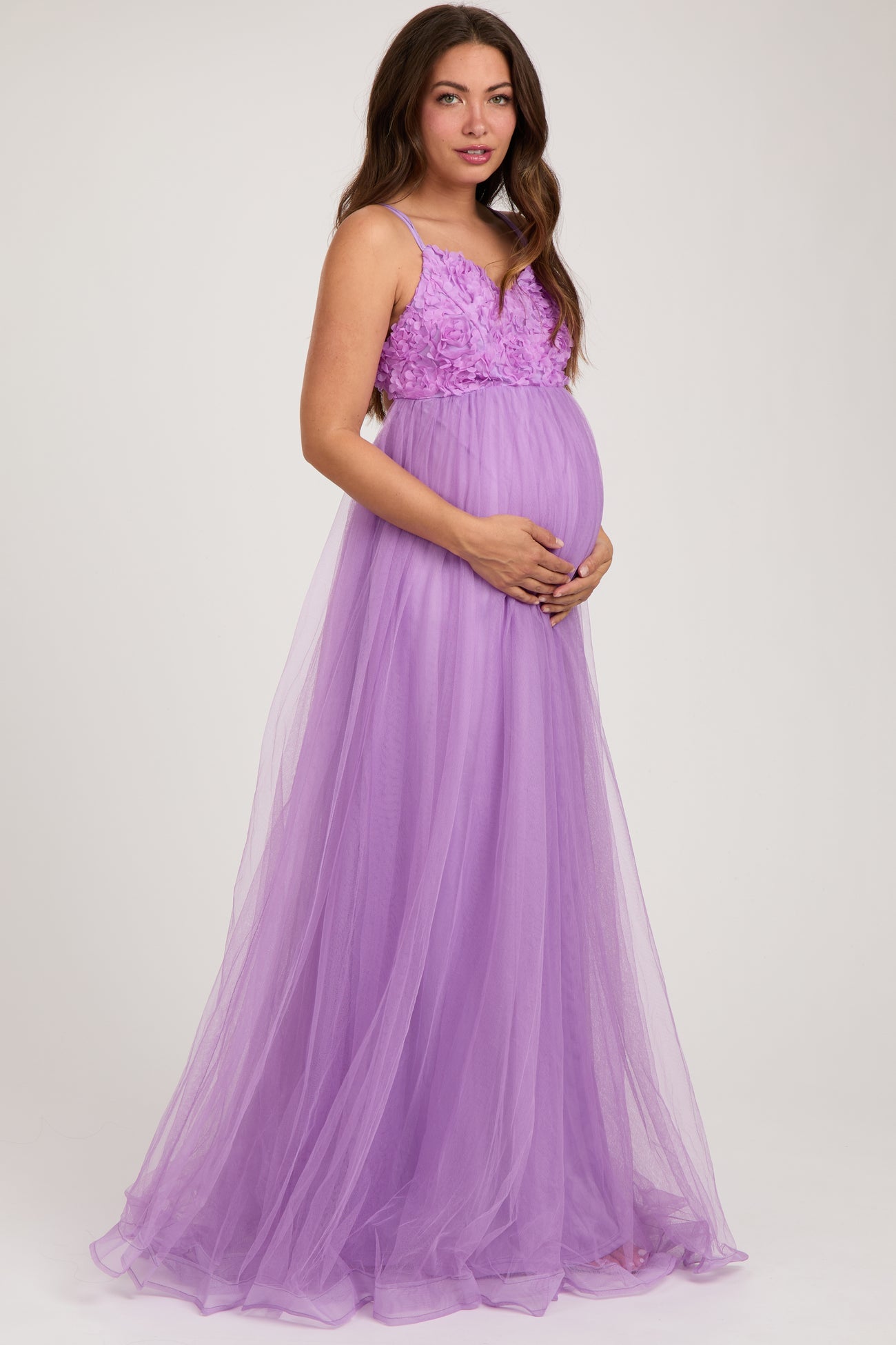 Purple Floral Applique Lace-Up Back Tulle Maternity Maxi Dress