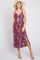 A floral sleeveless midi dress featuring adjustable cami straps, a knotted cutout front and a smocked back.