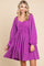 A solid hue dress featuring a sweetheart neckline, long sleeves, a smocked back, and a gathered waist.