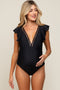 A satin maternity dress featuring a split v-neckline with ruffle trim, short puff sleeves and a ruffle hem.