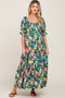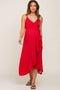 An animal print midi dress featuring a wrap v-neckline, an inside side button closure, double button accent at the waist, adjustable straps, and a flounce trim skirt.
