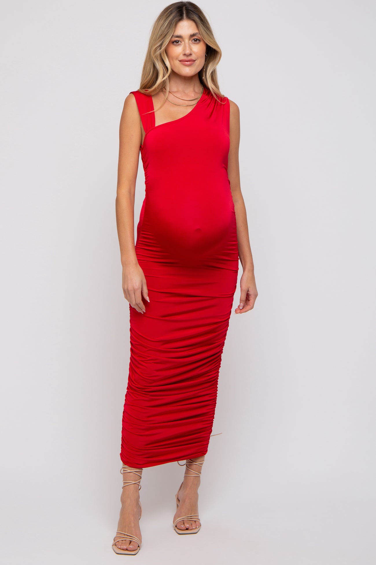 A fitted maternity dress featuring an asymmetrical neckline and all-over ruching.