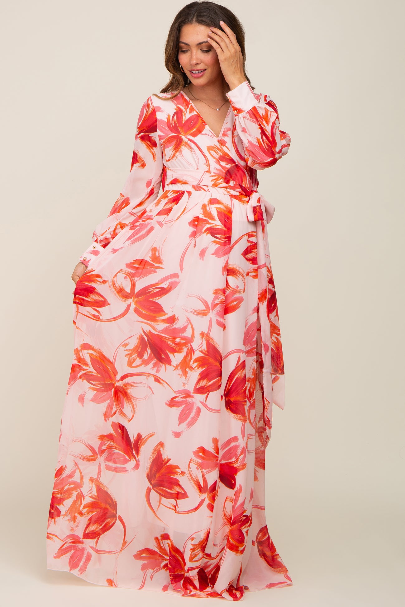 A printed chiffon maternity maxi dress with wrap V-neckline, long sleeves and sash tie waist. Elastic waistline. Bust and skirt lined. Sleeves semi sheer with button detail.