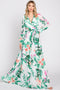 A printed chiffon maxi dress with wrap V-neckline, long sleeves and sash tie waist. Elastic waistline. Bust and skirt lined. Sleeves semi sheer with button detail.
