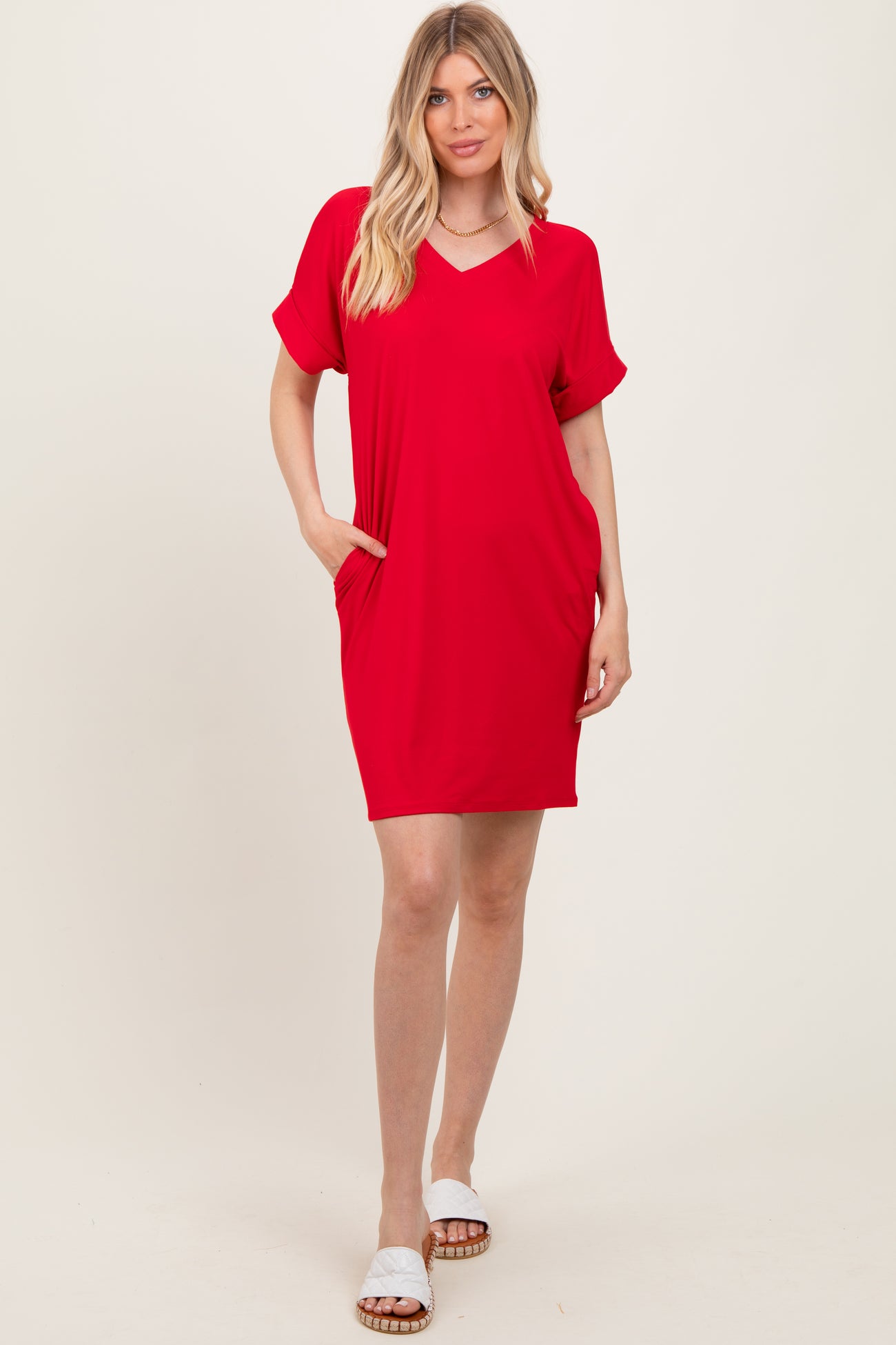 Red Brushed Rolled Short Sleeve V-Neck Dress