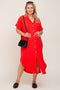 A solid plus maxi dress featuring functioning front buttons, a collar, two front pockets, cuffed short dolman sleeves, and a hi-low rounded hemline.