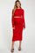 A maternity skirt including a crop top and midi skirt. Top features a rounded neckline, long sleeves, and exposed seams. Skirt features an elastic waistband and exposed seams.