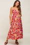 A floral maxi dress with adjustable straps, a deep v-neckline, smocking under the bust, side pockets, a gathered bottom tier, and an open back.