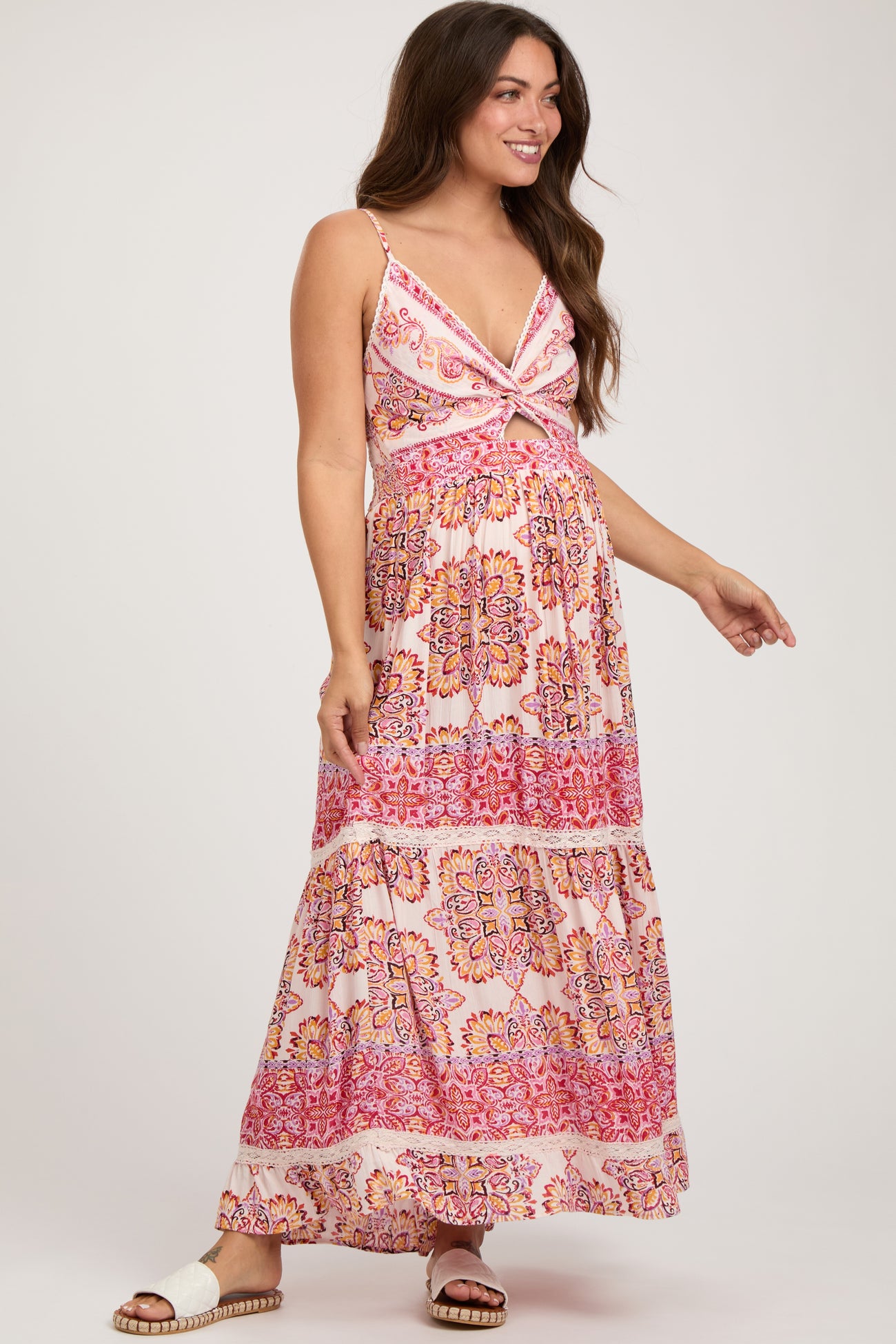 A floral paisley maternity maxi dress featuring a v-neckline, a front knot, adjustble cami straps, a smocked back, an empire waist and a tiered skirt with crochet trim.