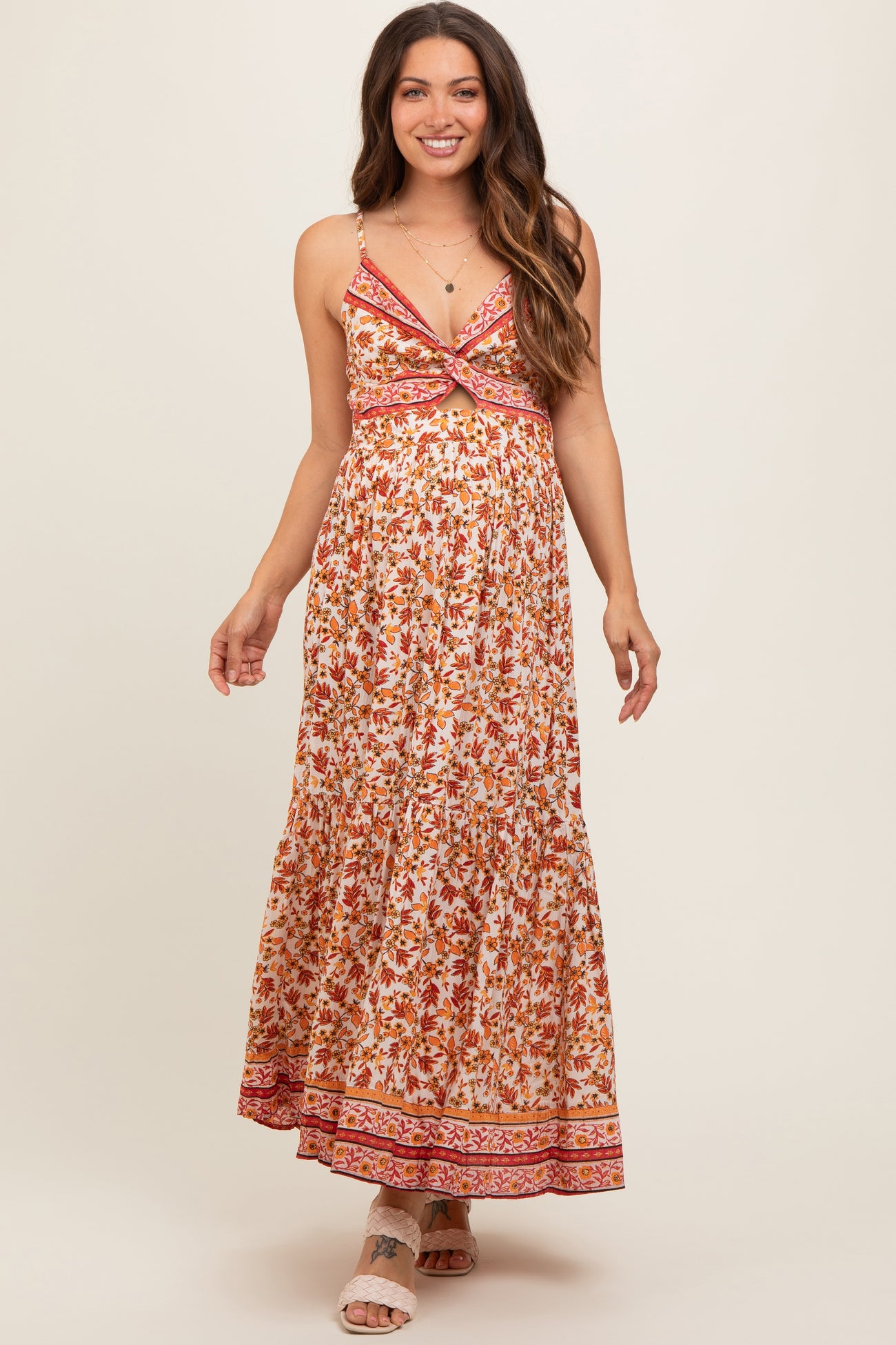 Floral maternity maxi dress featuring v-neckline, front knot twist and adjustable straps.