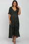 A floral print maternity midi dress featuring a v-neckline, short bubble sleeves with ruffle trim, an empire waist with an elastic band, pleated tiers and a ruffle hem.