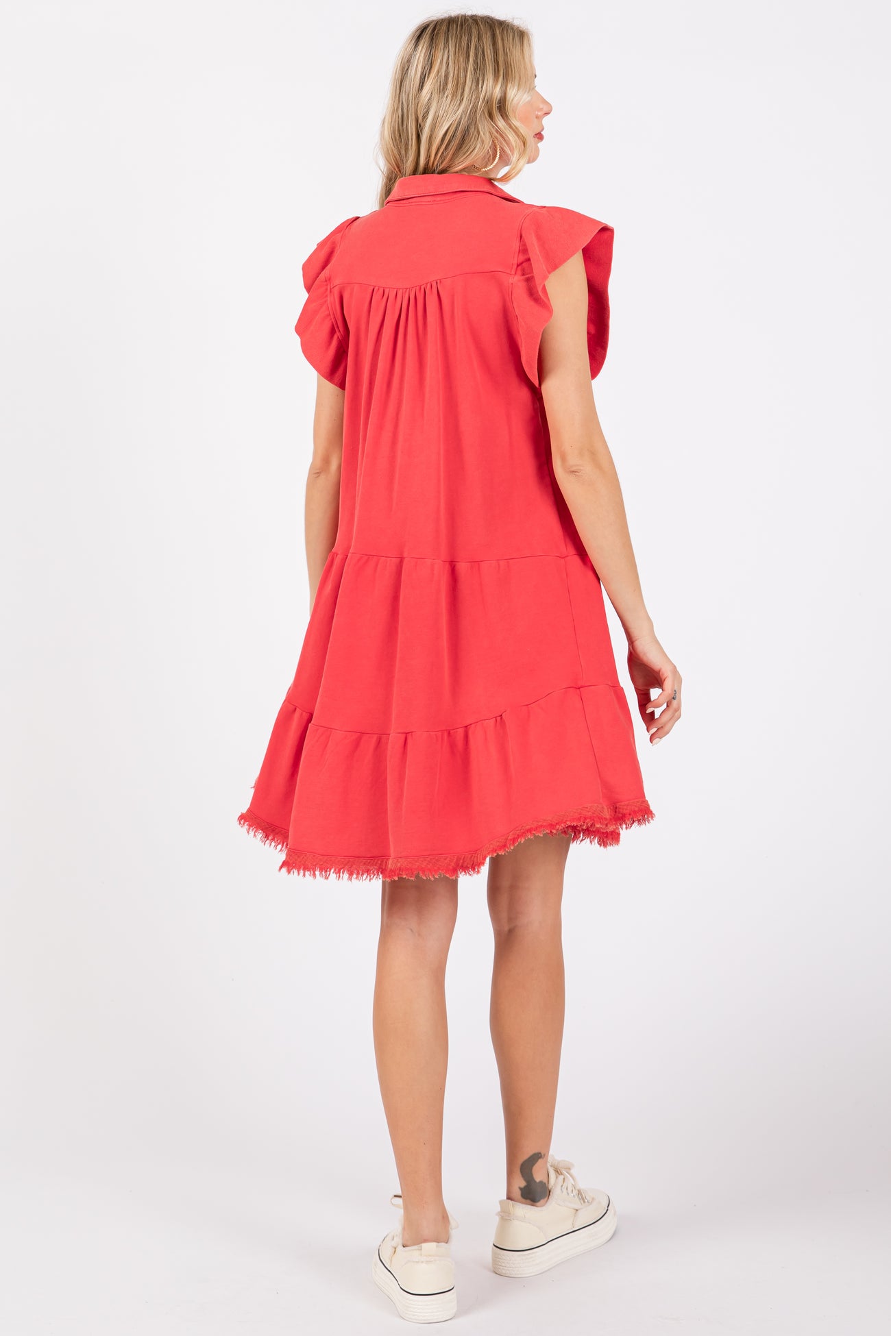 Details A french terry dress featuring flutter sleeves, a tiered skirt, a raw hem and a collared neckline. Content + Care