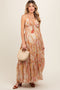 A high-low hem maternity dress featuring a self-tie halter neckline, back smocking, a ruffle hem and side pockets.