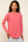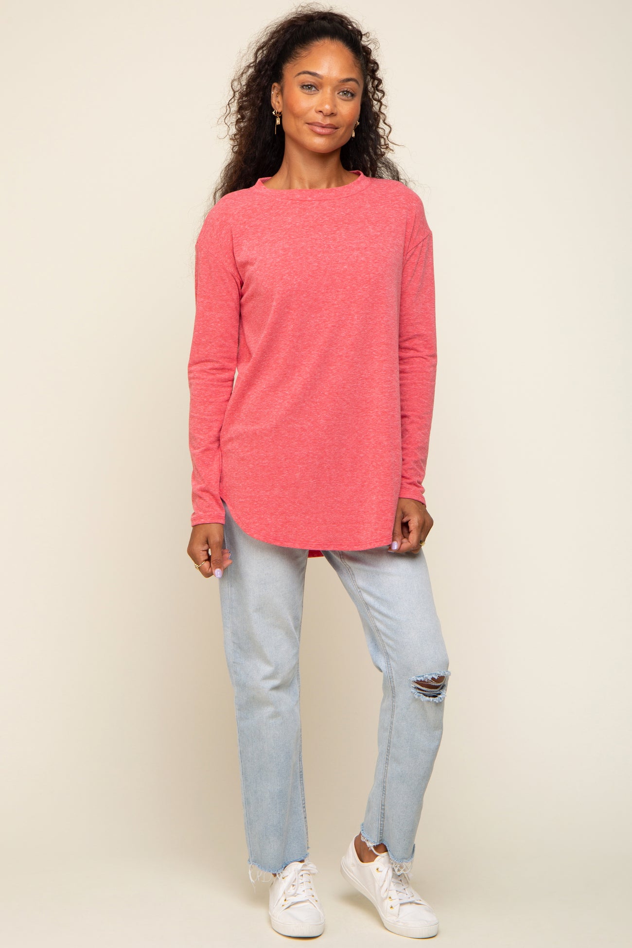 A heathered top featuring long sleeves, a curved hem and a rounded neckline.