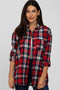 A plaid print maternity top featuring an oversize fit, front buttons, long sleeves and a collared neckline.