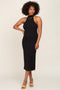 A solid sleeveless knit maternity midi dress with cross detail and sash tie in back.
