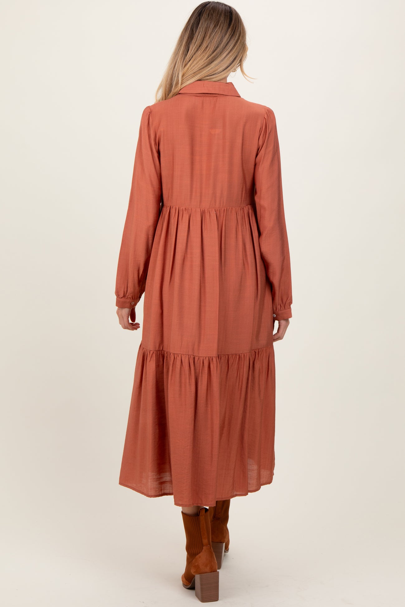 Rust Button Down Long Sleeve Maternity Midi Shirt Dress