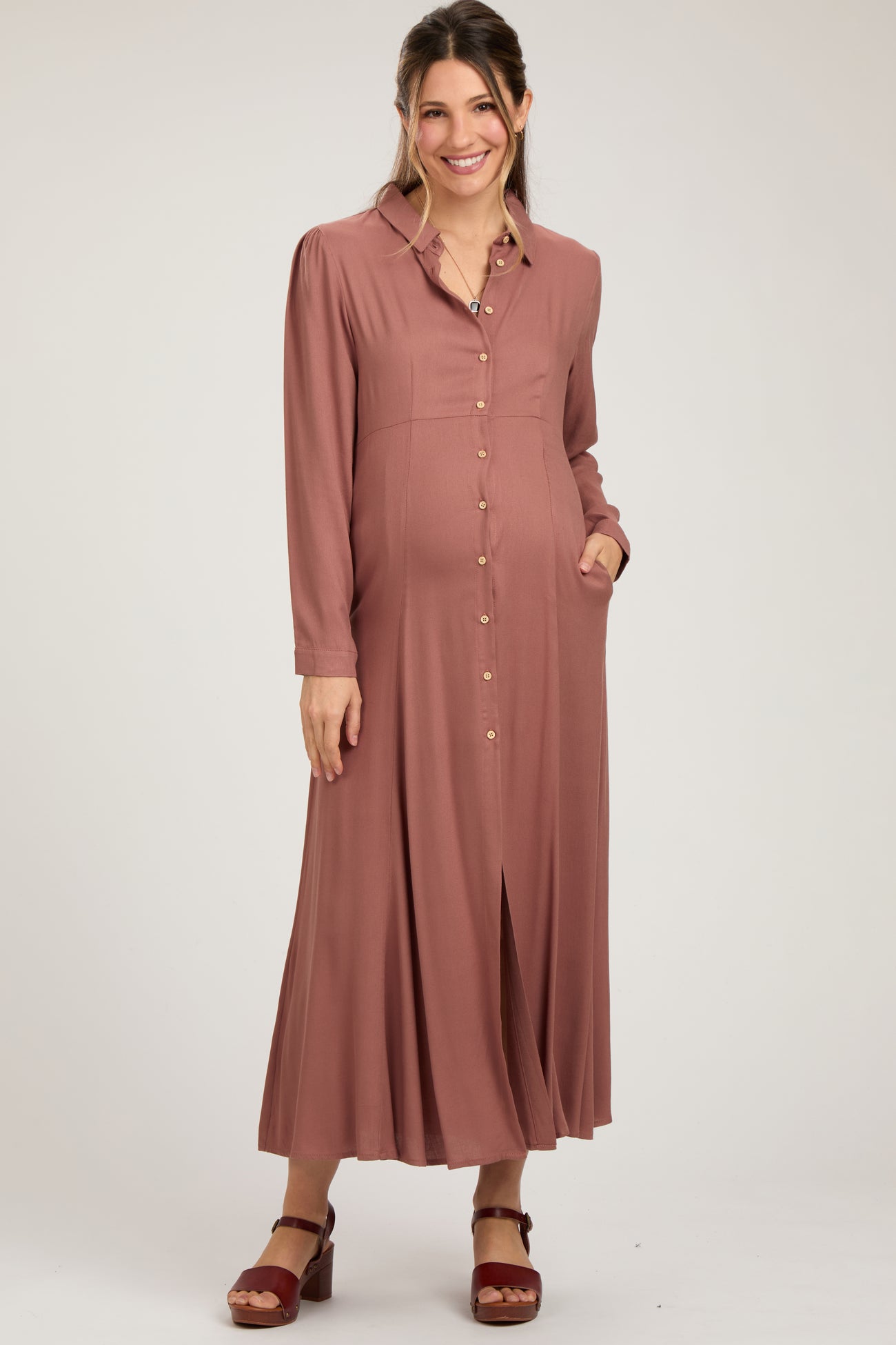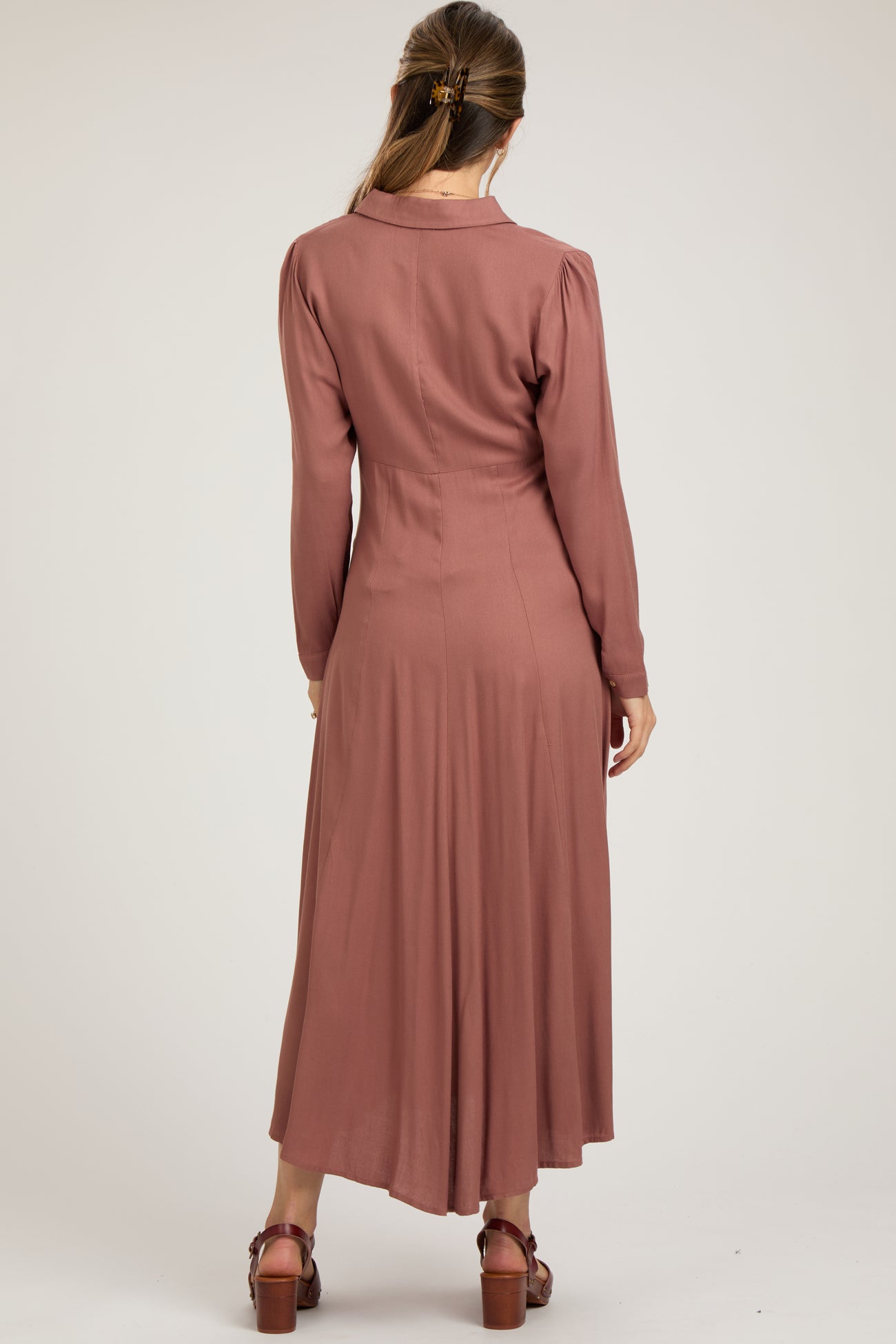 Rust Collared Button Down Long Sleeve Maternity Maxi Dress