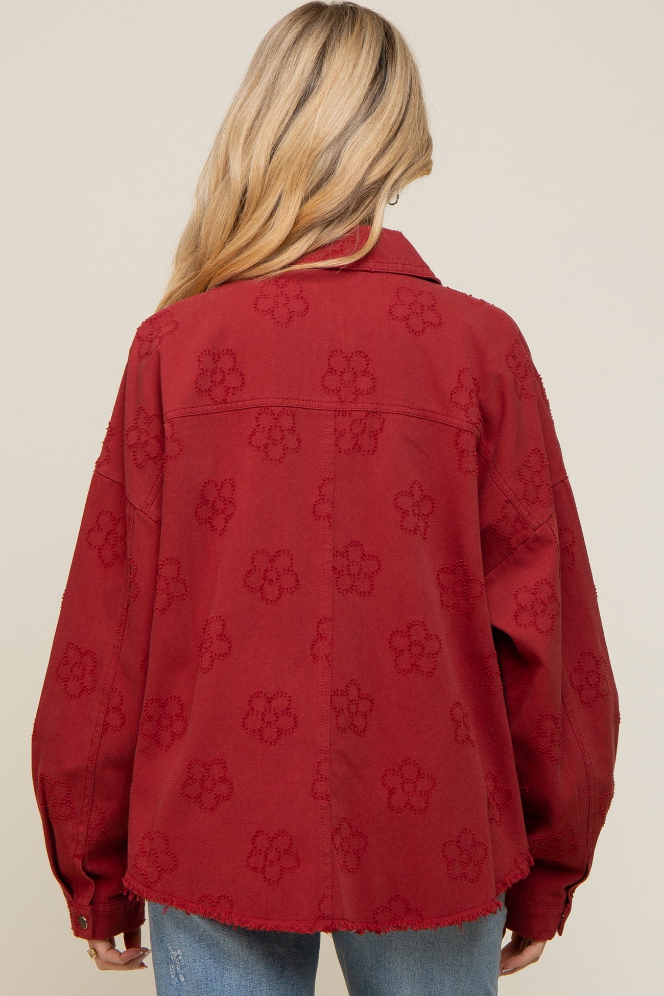 A solid maternity shirt jacket with floral embroidery and a fringe hem. Features collared neckline, snap button front closure and two chest pockets.
