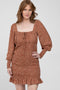 A fitted maternity dress featuring long sleeves with smocked accents, a tie front accent, a squared neckline, and a smocked skirt. Body is lined to prevent sheerness.
