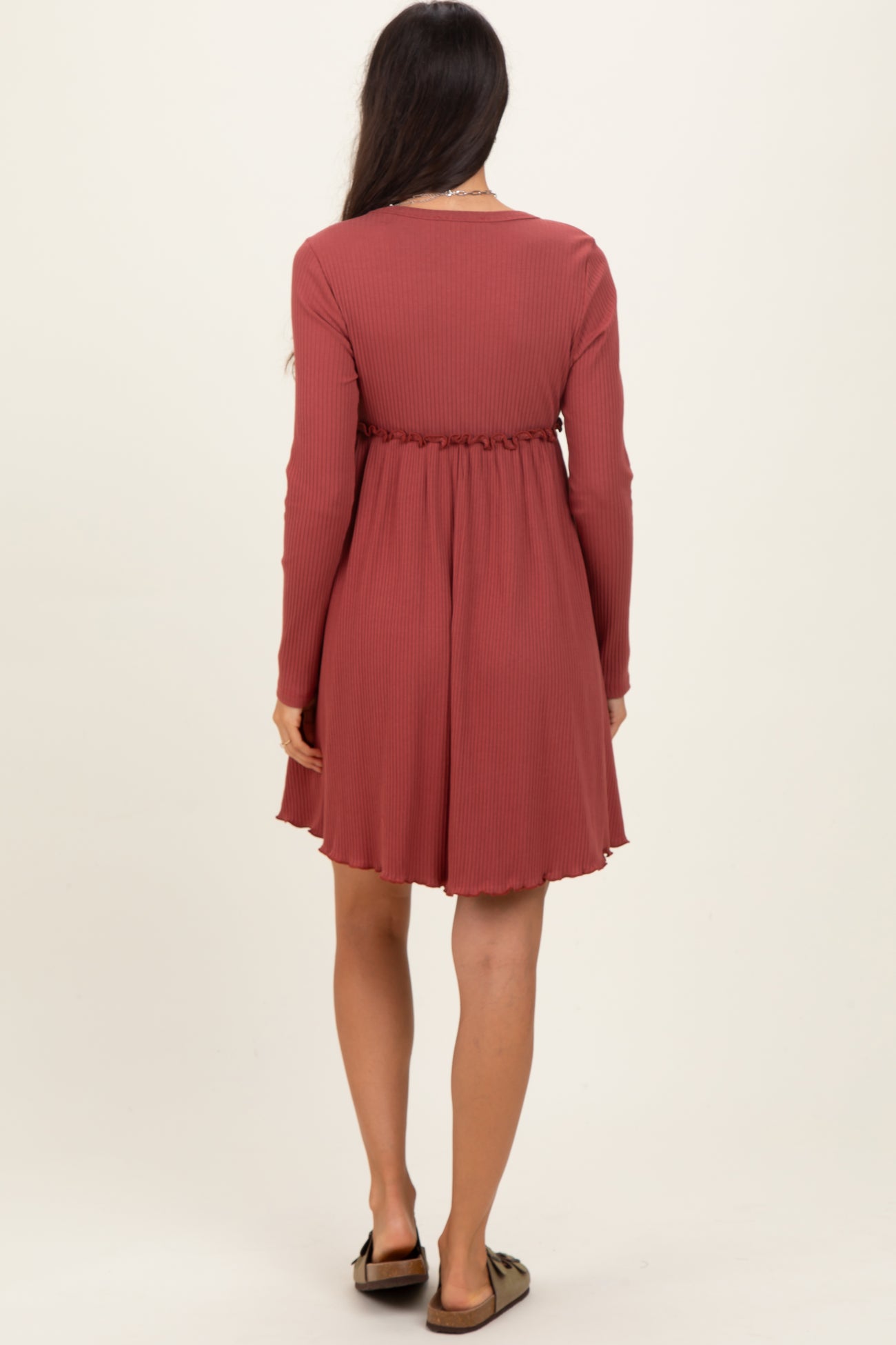 Elevate your casual wardrobe with this Rust Solid Ribbed Long Sleeve Crewneck Shirring Mini Dress. Crafted from soft, ribbed fabric, this dress features a flattering shirring detail that cinches just below the bust, creating a feminine silhouette. The warm rust hue adds a trendy touch, perfect for transitioning through seasons. Long sleeves and a classic crewneck offer comfort and versatility, while the mini length keeps it playful and chic. Pair it with sandals for a laid-back look or dress it up with ankle boots and accessories for effortlessly stylish vibes. Your go-to dress for everyday elegance!