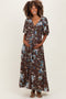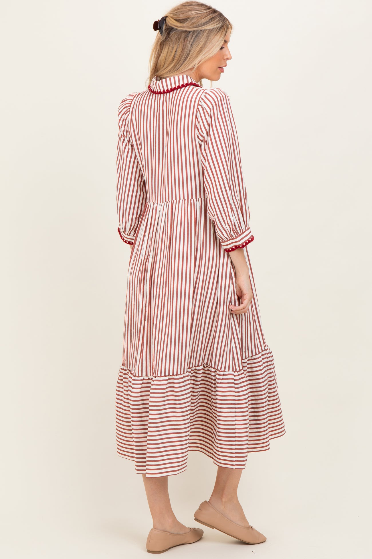 Rust Striped Scallop Trim 3/4 Sleeve Midi Dress