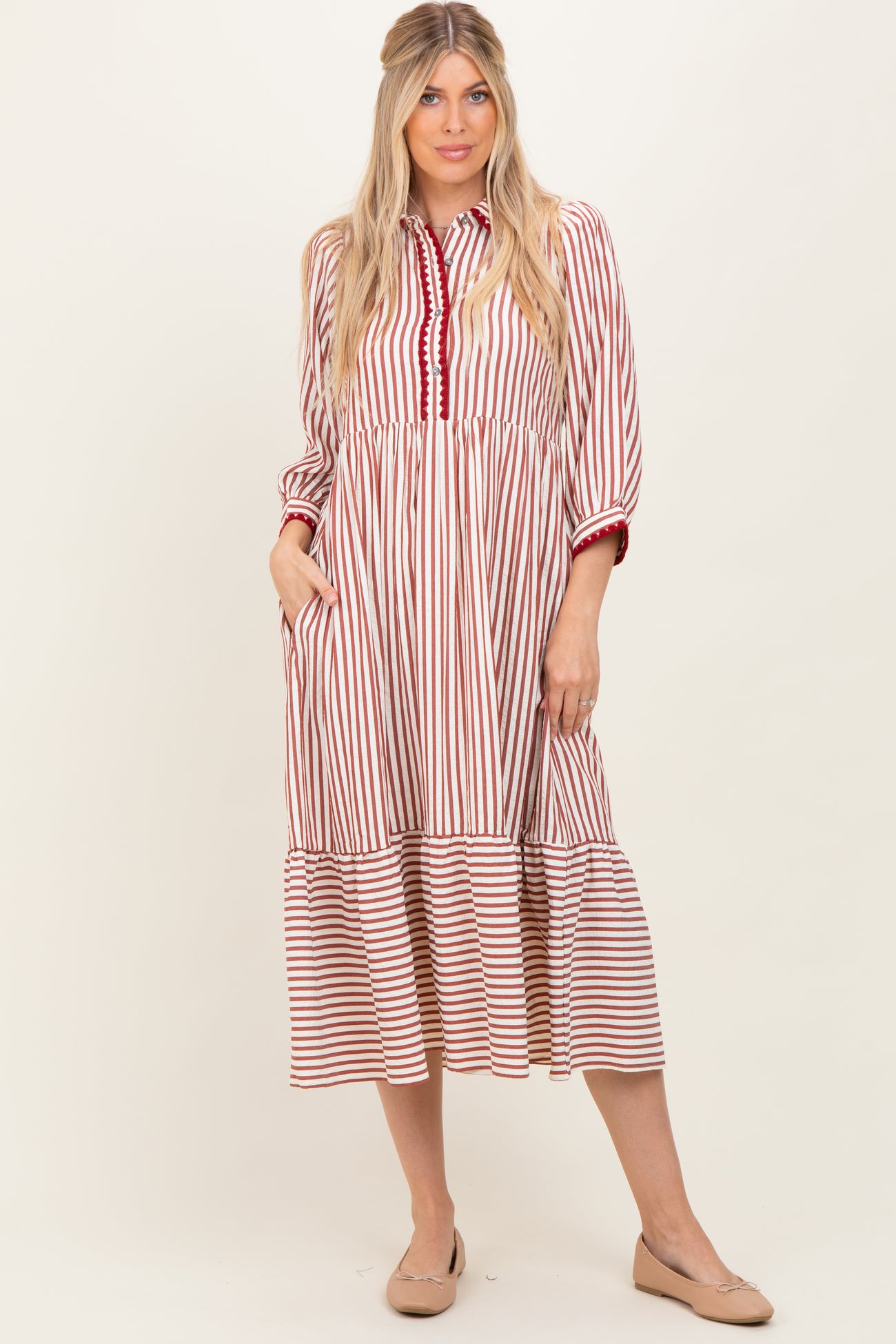 Elevate your wardrobe with this Rust Striped Scallop Trim Midi Dress, designed for effortless style and comfort. Featuring charming 3/4 sleeves and a flattering tiered midi length, this dress showcases vertical rust stripes contrasted with a scallop-trimmed collar and button placket for added detail. Lightweight and breathable, it’s perfect for both casual outings and dressier occasions. The relaxed fit gently cinches at the waist to enhance your silhouette, and side pockets add practicality without sacrificing style. Pair with flats or heels for versatile, all-day wear. Easy to dress up or down, this midi dress is a must-have staple this season.