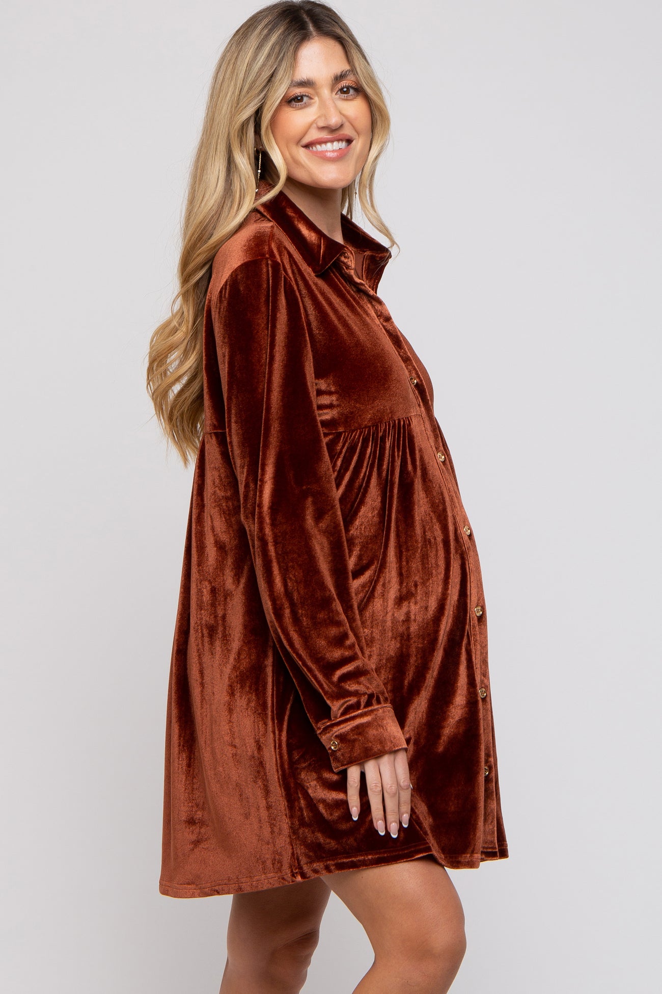 Details A solid velvet maternity shirt dress. Includes collared neckline, button down front closure and empire waist. Content + Care