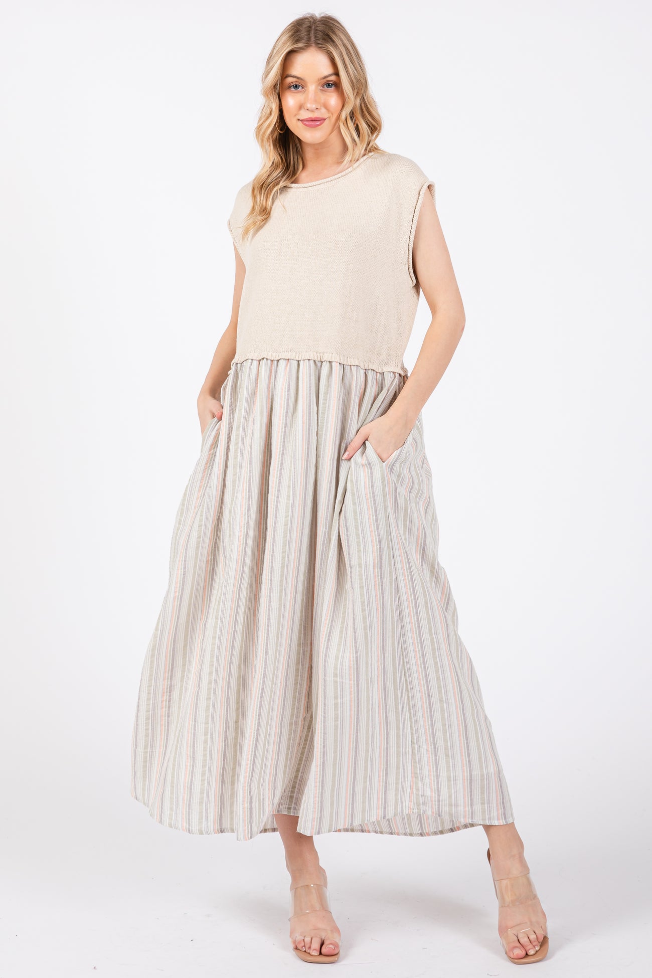 Sage Knit Striped Skirt Pocketed Sleeveless Midi Dress