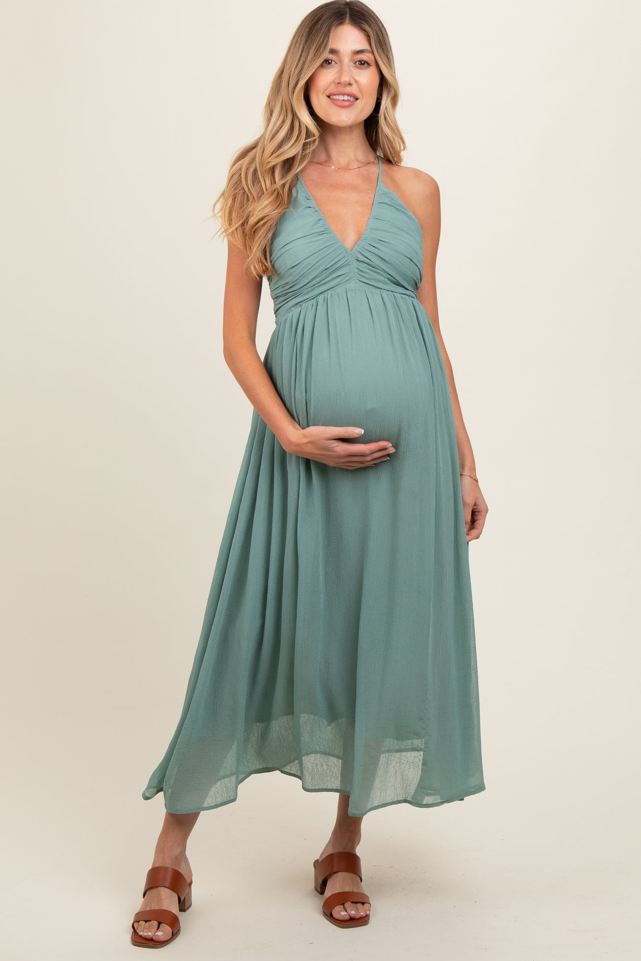 Sage Ruched V-Neck Maternity Midi Dress