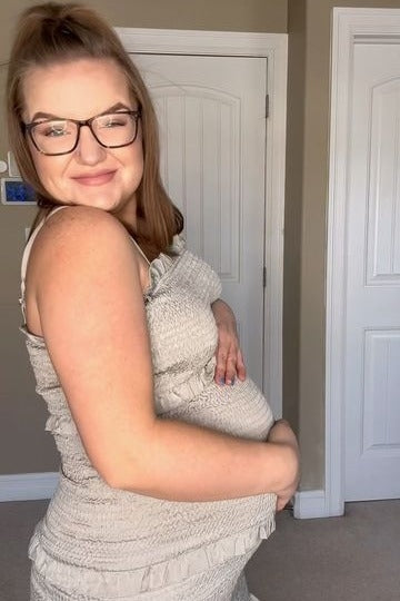 A solid satin maternity midi dress featuring a smocked elastic body with ruffle trim and adjustable cami straps.