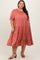 A solid hue plus size dress featuring a round neckline, short cinched sleeves, a tiered body, a back keyhole button closure, and side pockets.
