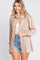 A pleated velvet top featuring a collared neckline, a button up front, two front pockets and long sleeves.