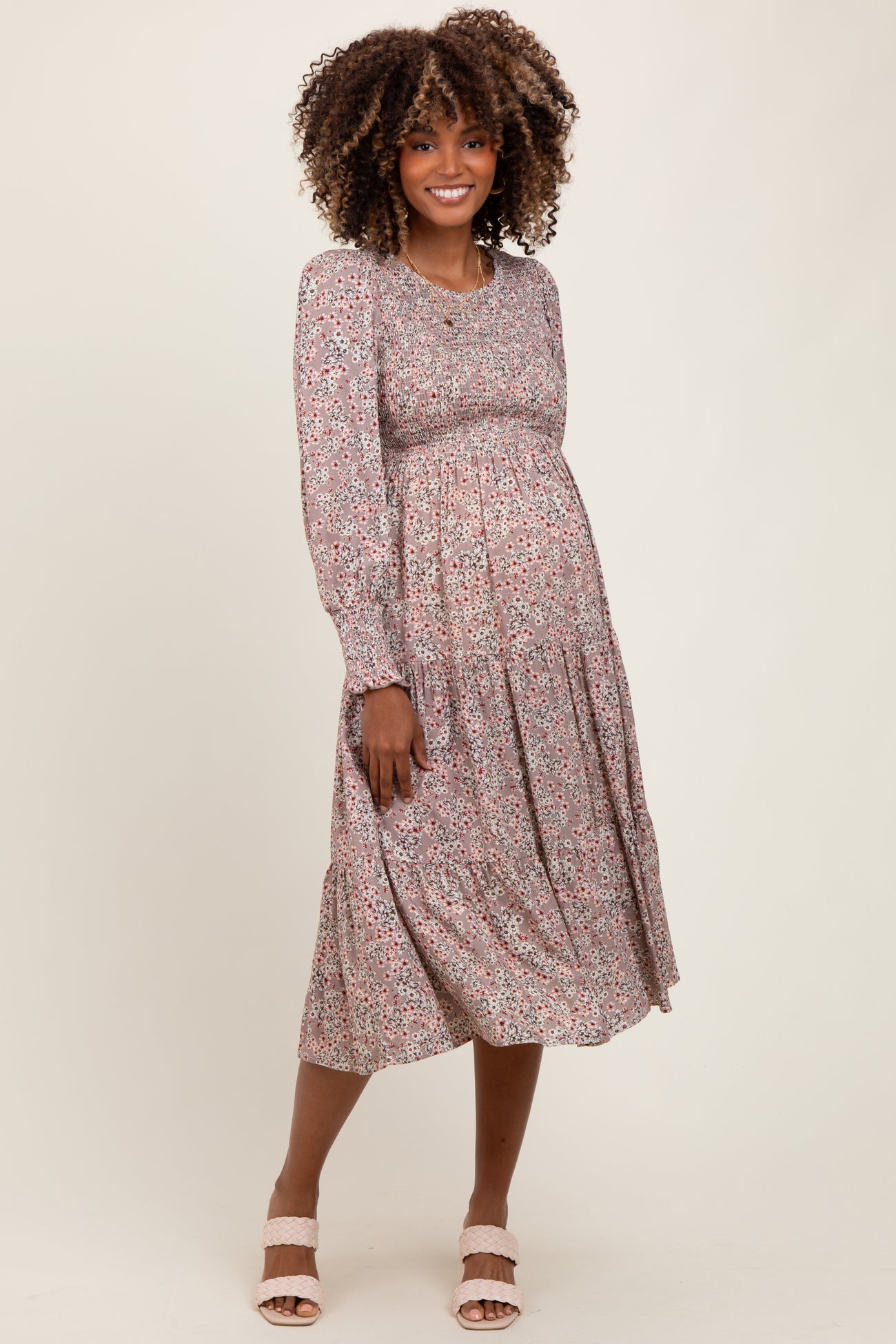 Taupe Floral Smocked Bubble Sleeve Maternity Midi Dress