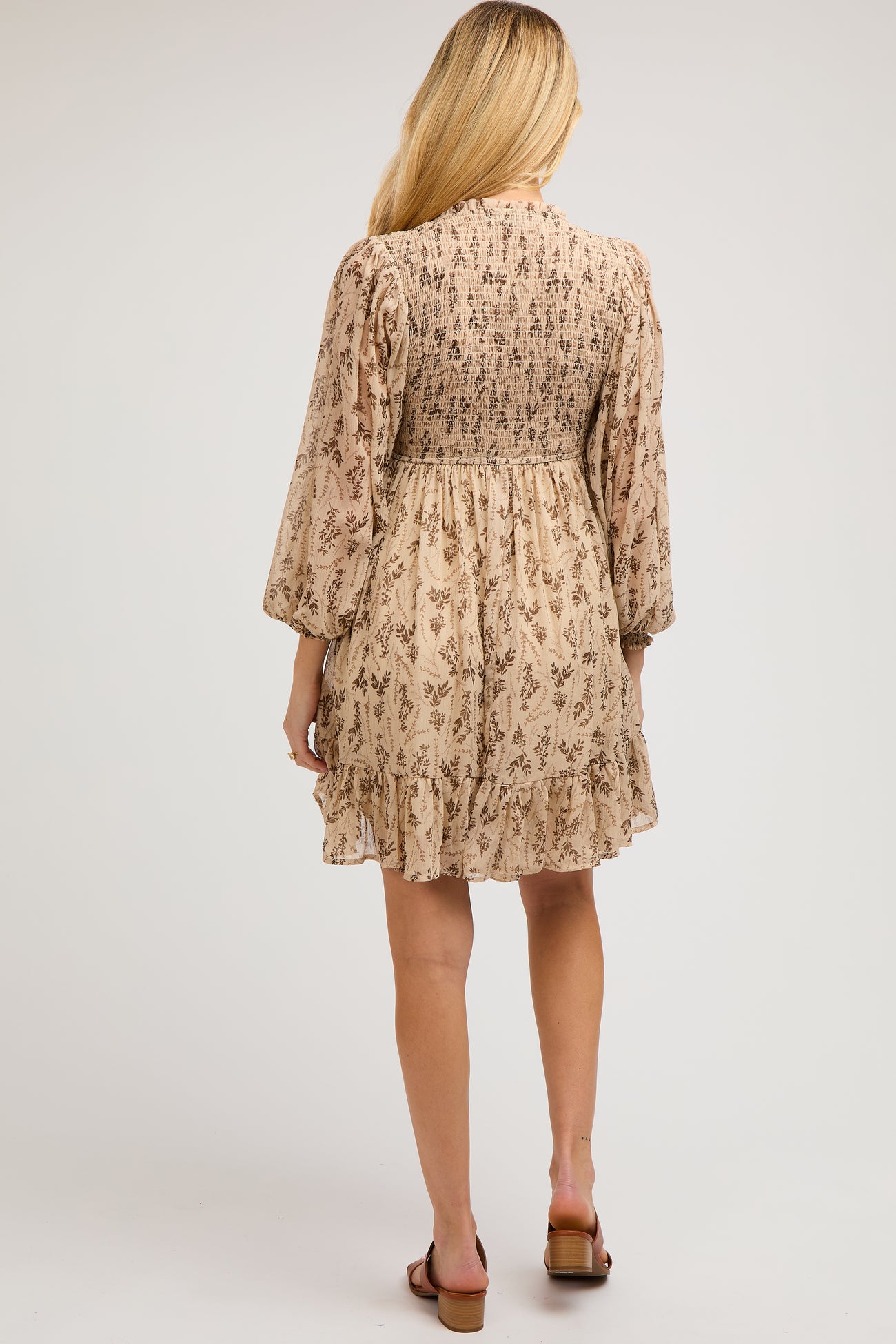 Taupe Floral Smocked Long Sleeve Maternity Dress
