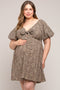 A lightweight midi dress with a squared ruffle accent neckline, 3/4 length puff sleeves, a front tie, and a smocked top.