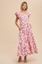 A leaf print jumpsuit featuring a square neckline, thin straps, a smocked bodice, side pockets and a wide hem.