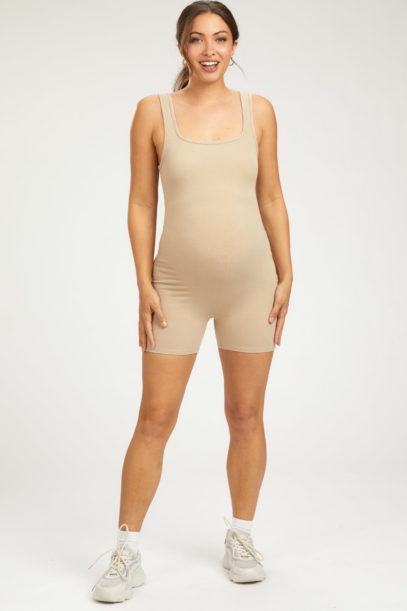 A ribbed knit maternity romper featuring a square neckline and tank straps.