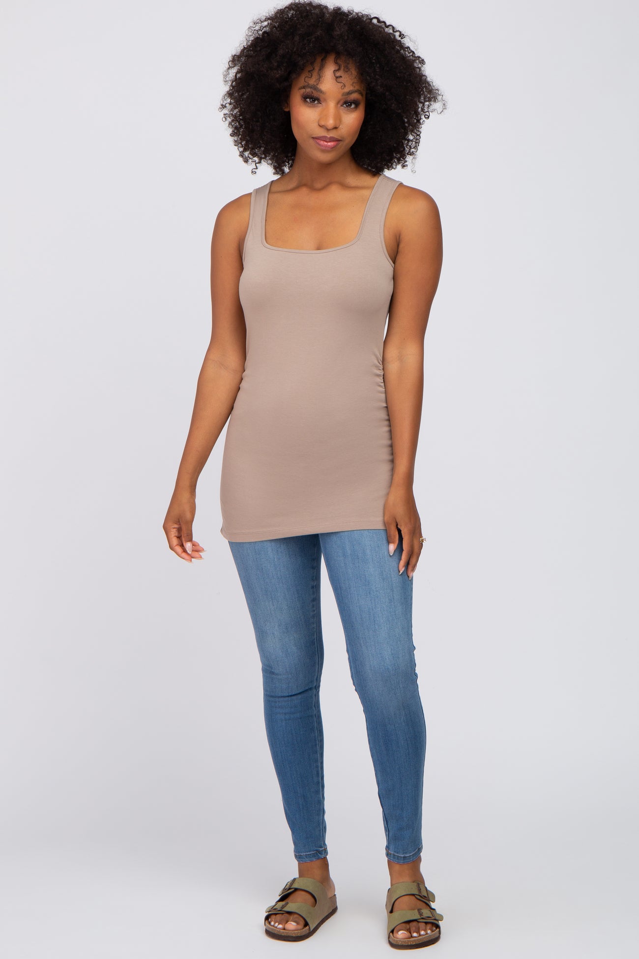A solid hue tank top featuring a squared neckline and ruched sides.