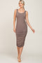 A soft knit maternity midi dress featuring ruching on the sides and back, a scoop neckline and a v-back.