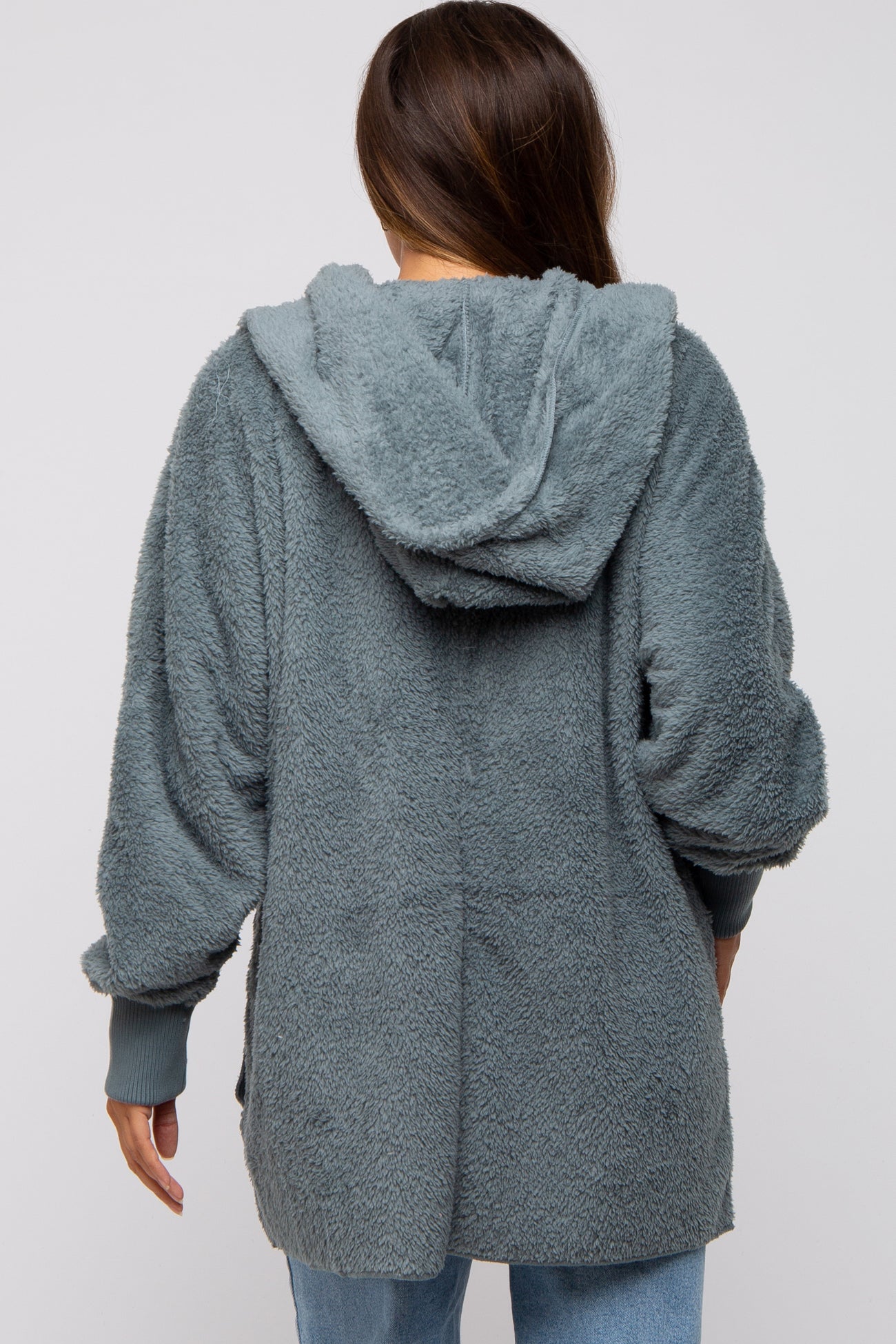 A solid hooded fuzzy maternity jacket. Long sleeves with ribbed cuffs. Open front. Front pockets.