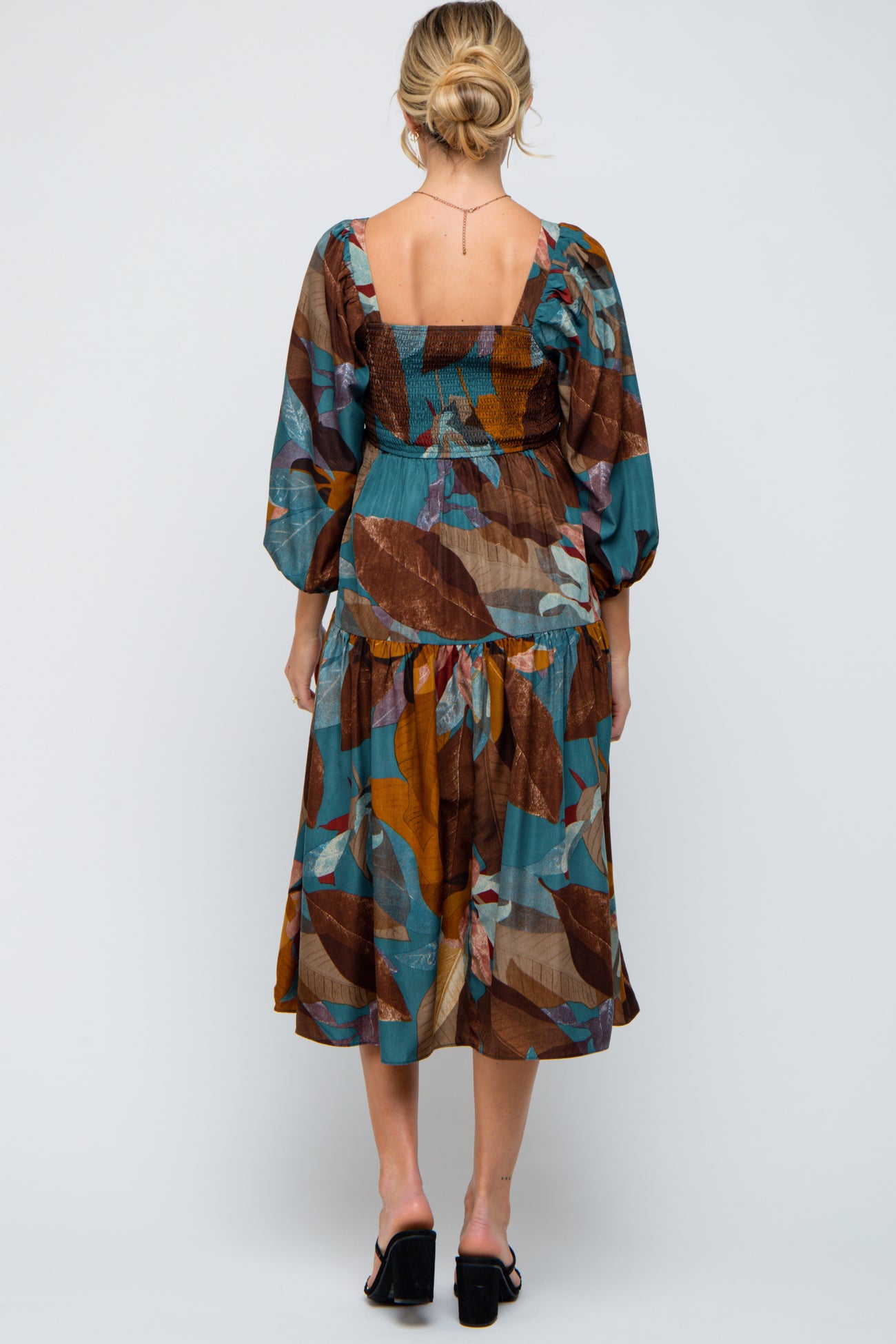 A leaf print maternity midi dress featuring a square neckline, 3/4 length puff sleeves, a smocked elastic back and an A-line skirt.