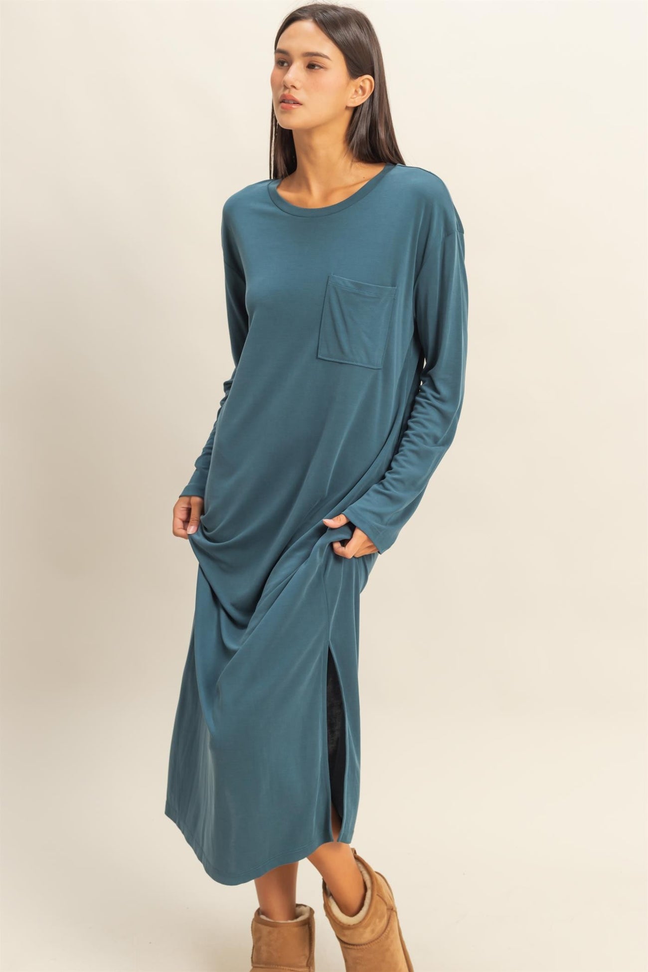 Stay effortlessly chic and cozy in our Teal Oversized Long Sleeve Midi Dress. Designed with a relaxed fit and soft, breathable fabric, this dress features a flattering round neckline, a convenient chest pocket, and subtle side slits for easy movement. Perfect for lounging at home or casual outings, its versatile midi length pairs beautifully with boots or sneakers. Embrace comfort without compromising style with this must-have wardrobe staple, available now in a beautiful teal hue. Easy to dress up or down, it’s your go-to for laid-back sophistication all year round.