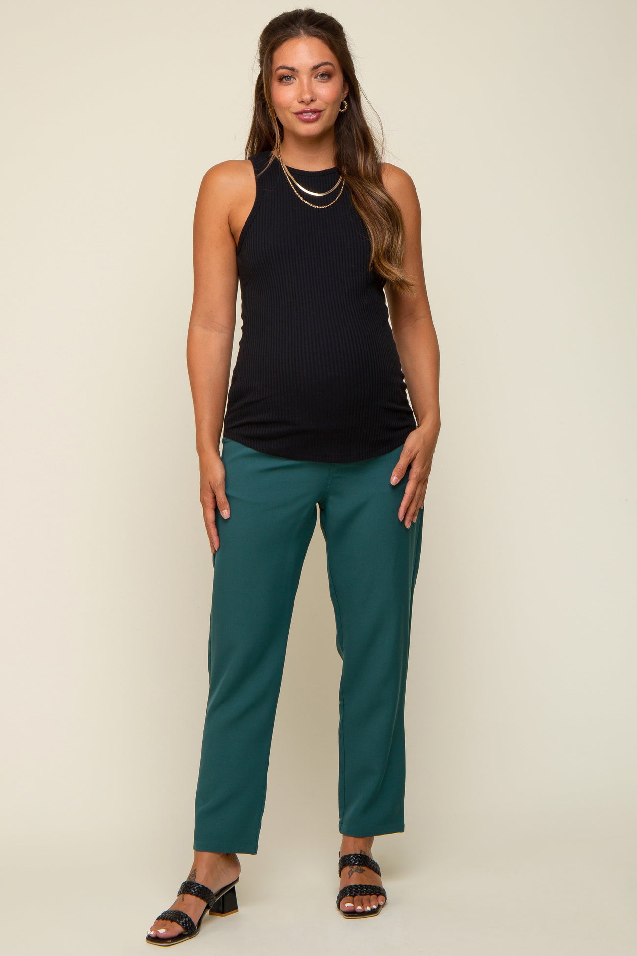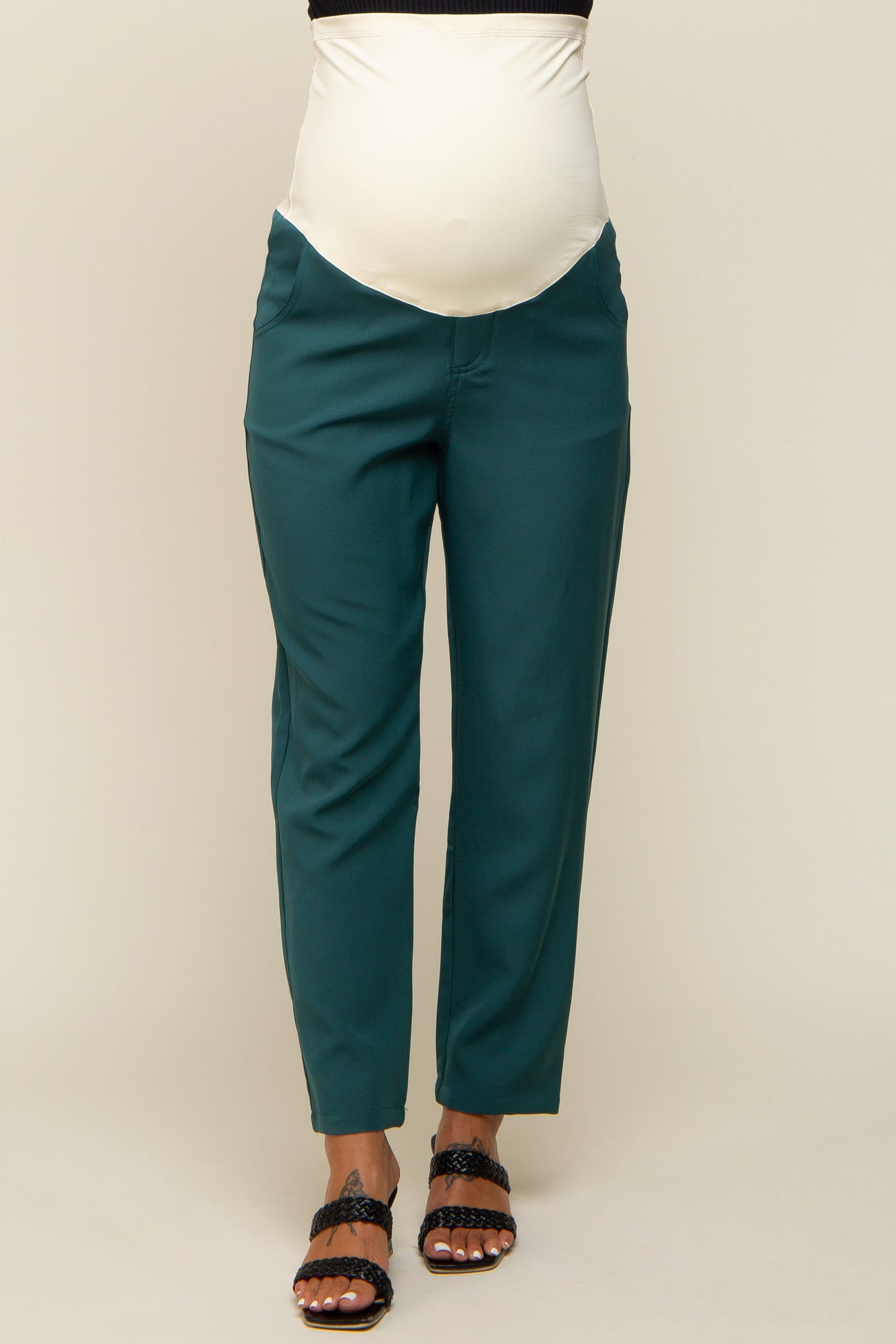 A pair of satin maternity pants featuring an elastic waistband, a button and zipper closure and side pockets.