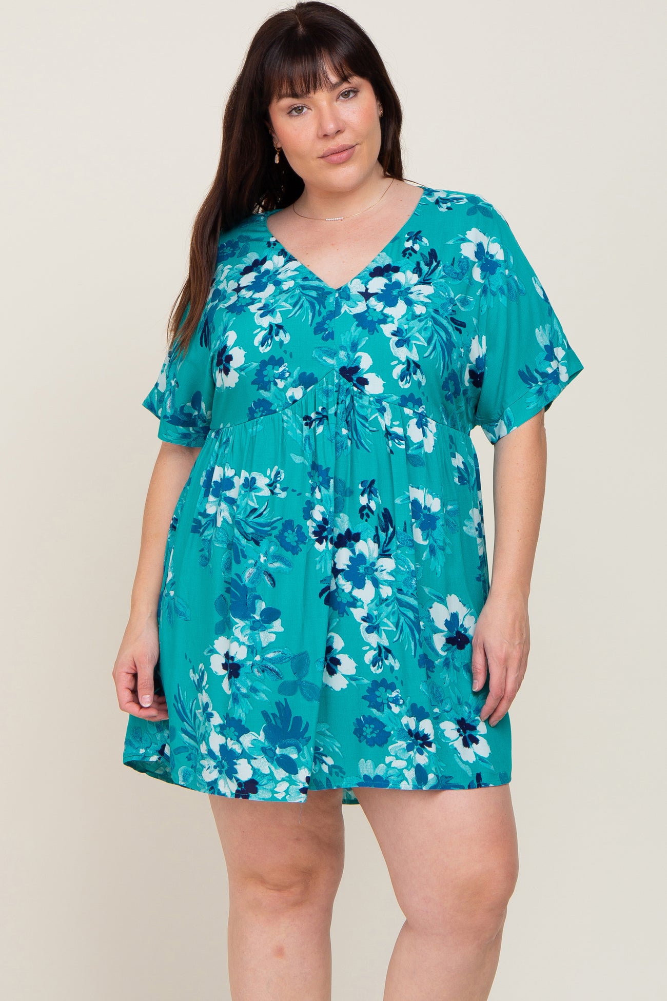 Teal Tropical Floral V-Neck Short Sleeve Dress