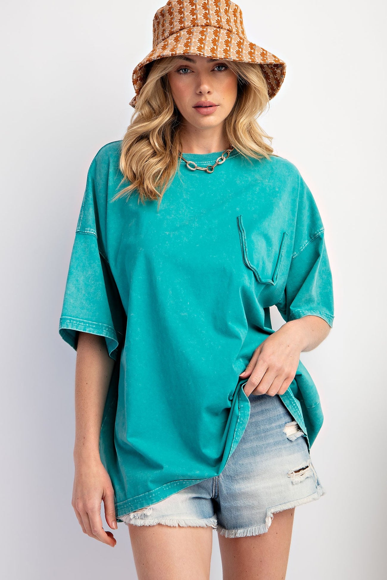 A solid oversized short sleeve top with a crew neckline and faux pocket detail on chest.