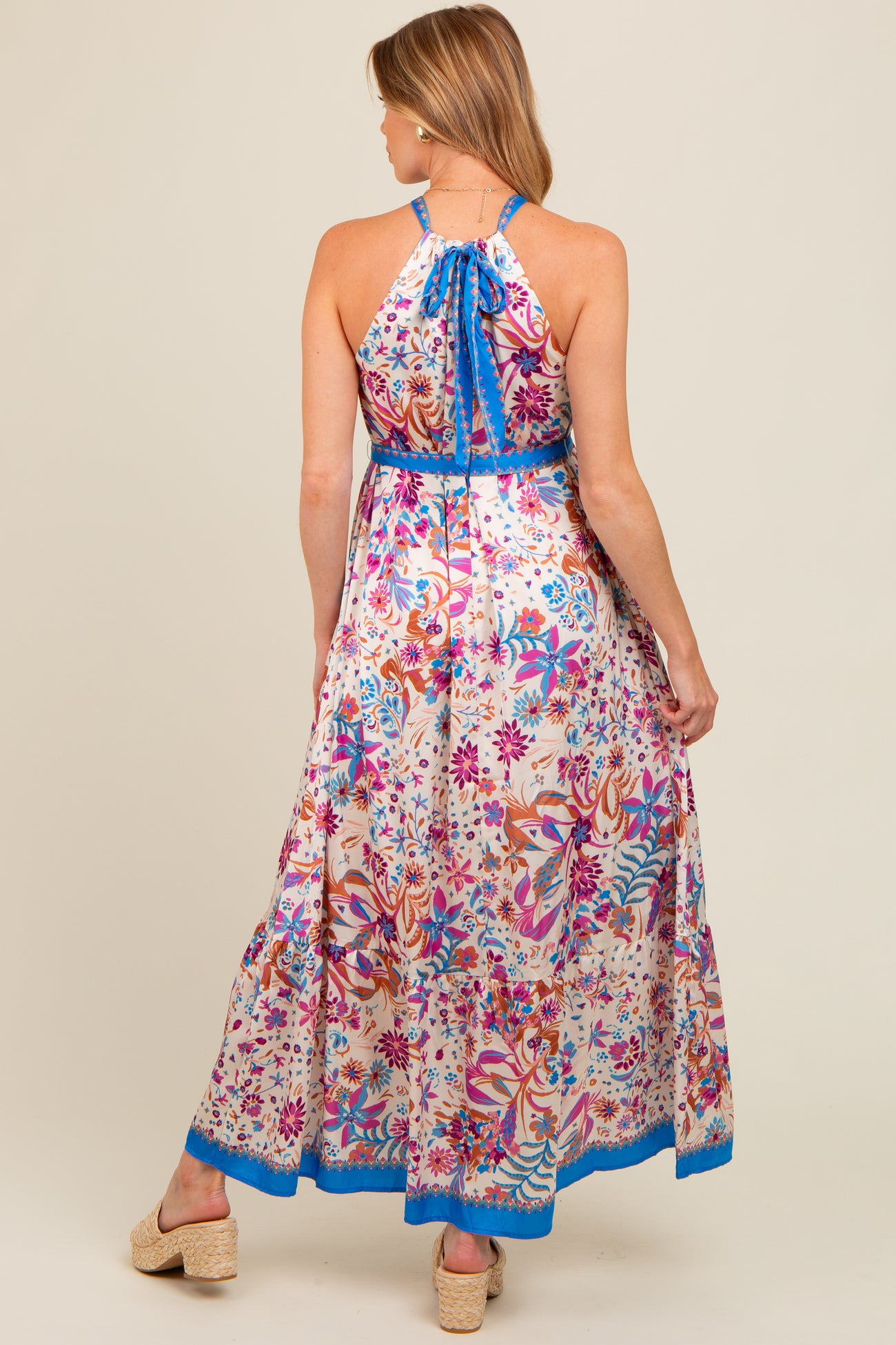 Violet Floral Halter Front Tie Maternity Maxi Dress
