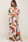 A floral maternity maxi with a wrap v-neckline, short dolman sleeves, a smocked waist, back tie, and side slit. Skirt is partially lined.