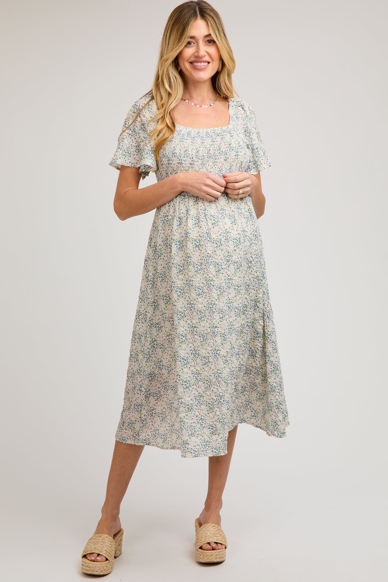 A smocked floral print maternity midi dress featuring short sleeves and a square neckline.