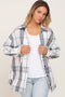 A printed maternity button up top with a collar, a slight hi-low rounded hem line, cuffed long sleeves, and two front pockets.